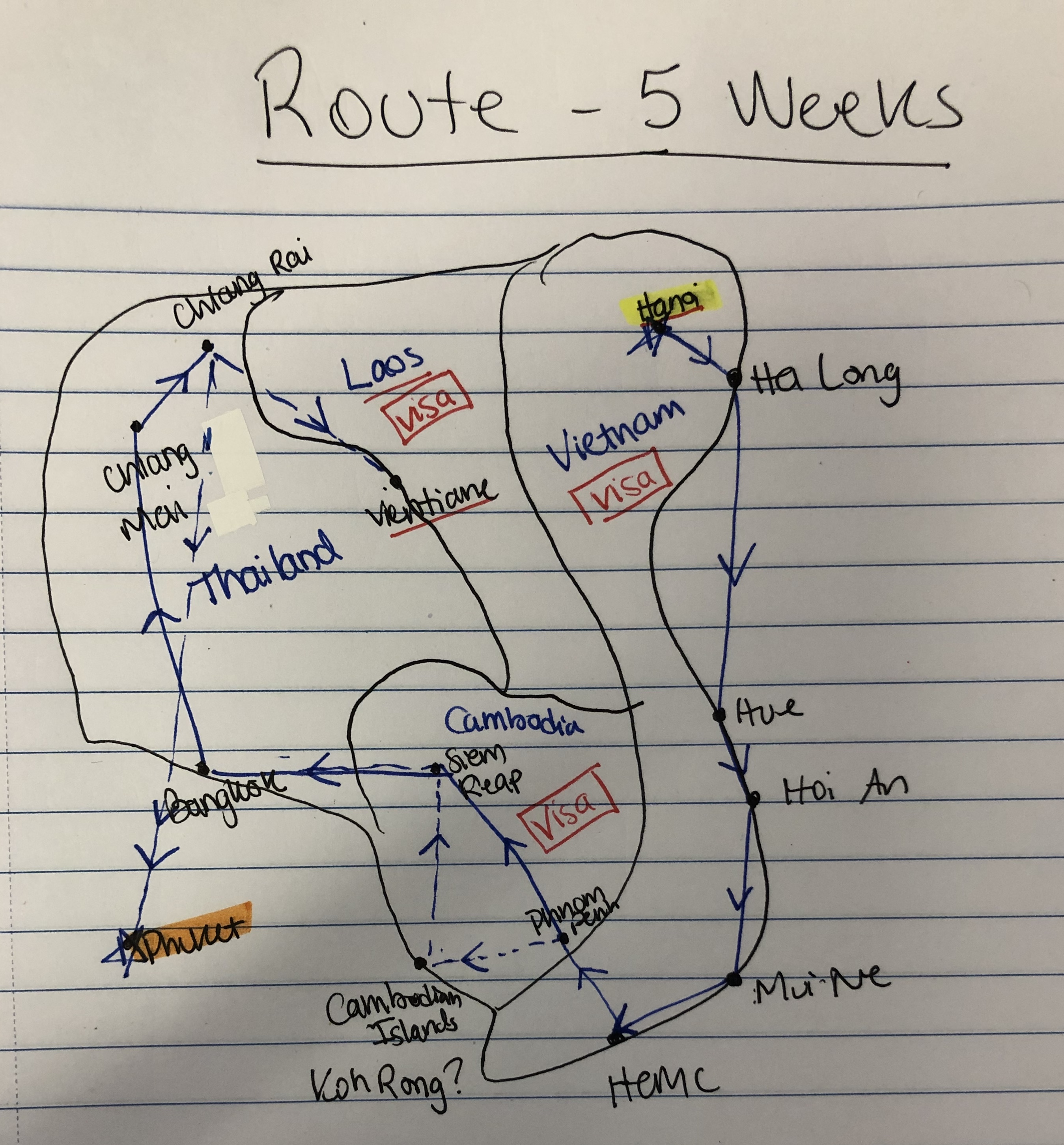 Decided to pen my own potential route. So far, all I have planned is Hanoi and and overnight cruise to Ha Long Bay (bay full of limestone islets). This might be a bit ambitious for 4-5 weeks, but who knows? Maybe I’ll end up just staying in Vietnam!