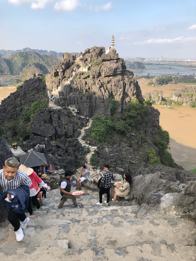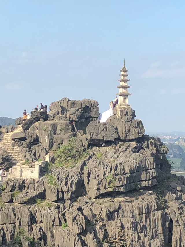 Our first few stops on the tour were to some ancient Hoa Lu temples built to honor kings of the Dinh and Le dynasties. Then, our tour guide took us in a surprise bike tour through the valleys of the limestone mountains. This was also my second time on a bike in 15 years so I count that as quite an adventure in itself. Then we visited Tam Coc, a world heritage site, and were treated to a bamboo boat ride through the mountains and caves. Not only was this one of the most serene and beautiful boat rides I’ve ever taken, but also I was impressed that every boat driver steered the boats with his/her feet on the oars. No hands necessary! The final part of the tour, also a surprise, was a steep hike to the top of Hang Mua Peak to see a shrine and amazing views of Tam Coc. I couldn’t even feel bad for how winded I was by the time I got to the top because there was a bride and groom taking wedding photos in full attire, heels, and makeup at the peak when we got there. And the bride’s dress train was at least 6 feet long. That was some serious wedding photo dedication, but I can understand the desire to have such a beautiful backdrop.