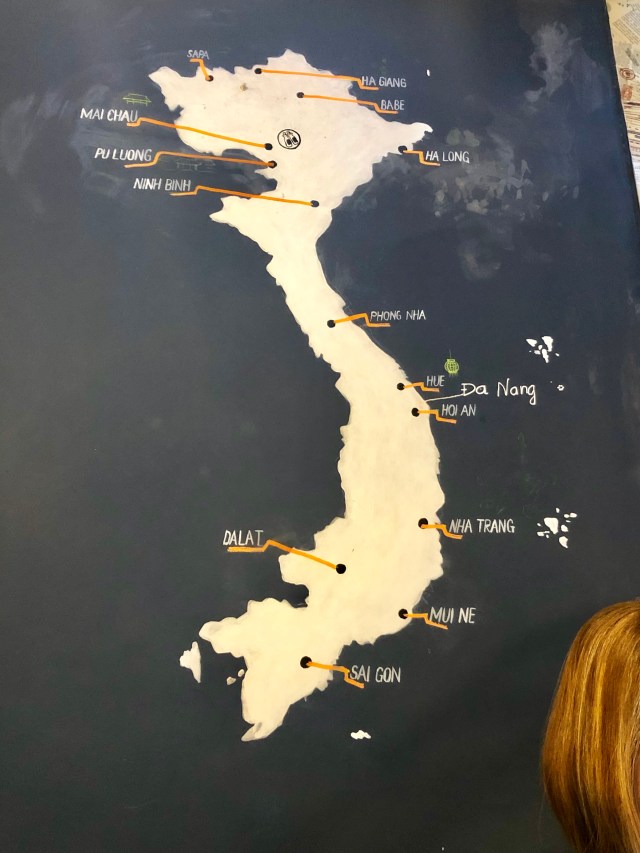 Hanoi was pretty great, with all of the amazing art and street food (see below). But now it’s time to move south. Next stop: Da Nang. If you’re looking at this awesome map someone drew at the hostel, I’m moving from the top of the eastern coast of Vietnam (marked Halong) to the middle (Da Nang).