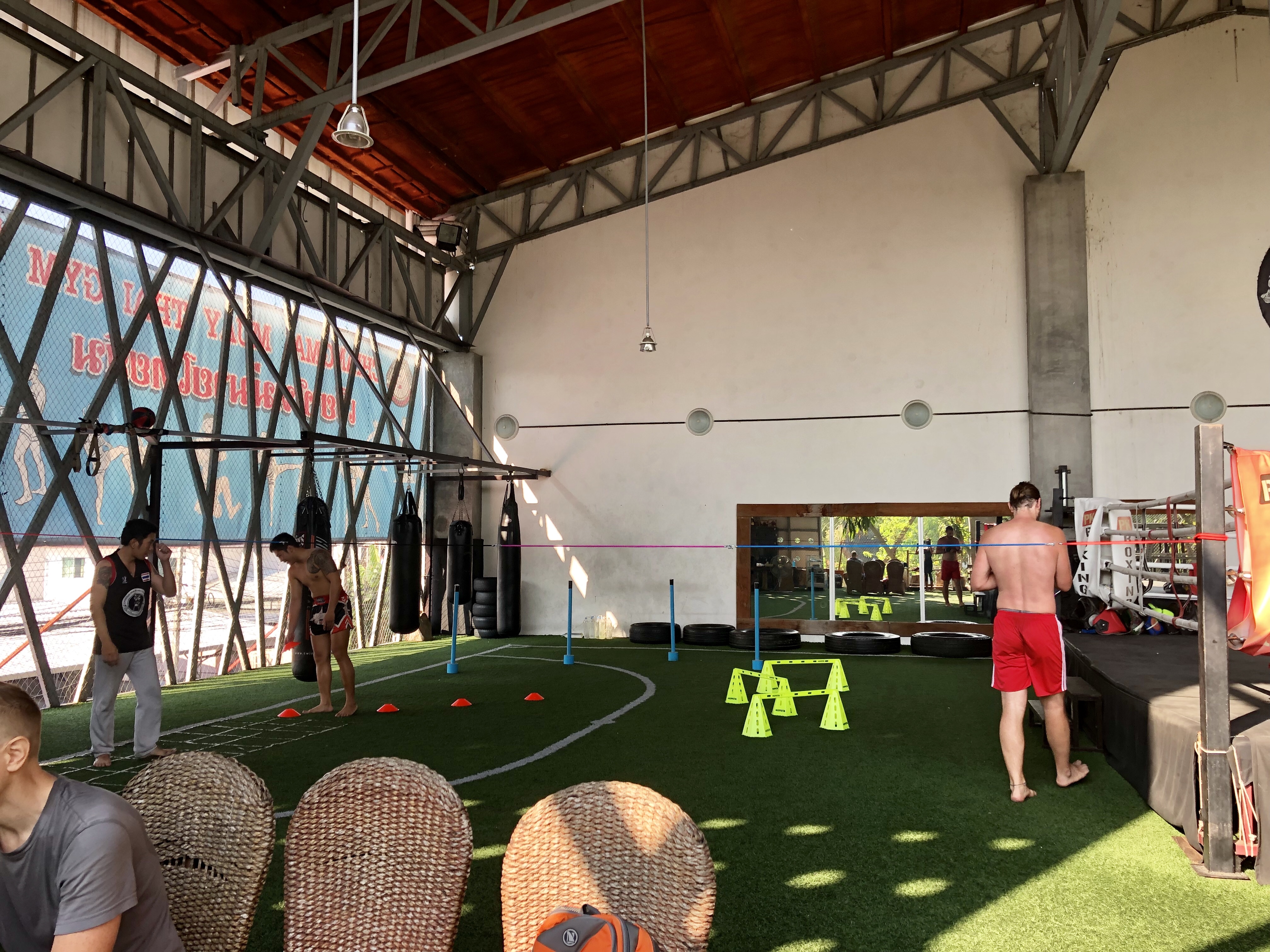 The trainings were pretty brutal–intense stretching, sprinting around the ring for 10 mins, bag work, move technique, and sparring with a trainer in the ring. For context, the trainers are all career fighters in Thailand. They were really encouraging teachers and some even simulated real fight maneuvers. For example, when I was practicing roundhouse kicks, I ended up being surprise kicked in the stomach. It was a little painful, but I certainly felt the excitement of having to literally think on my feet. I also learned a few new moves, such as upward and reverse elbow jabs and spinning back kicks.