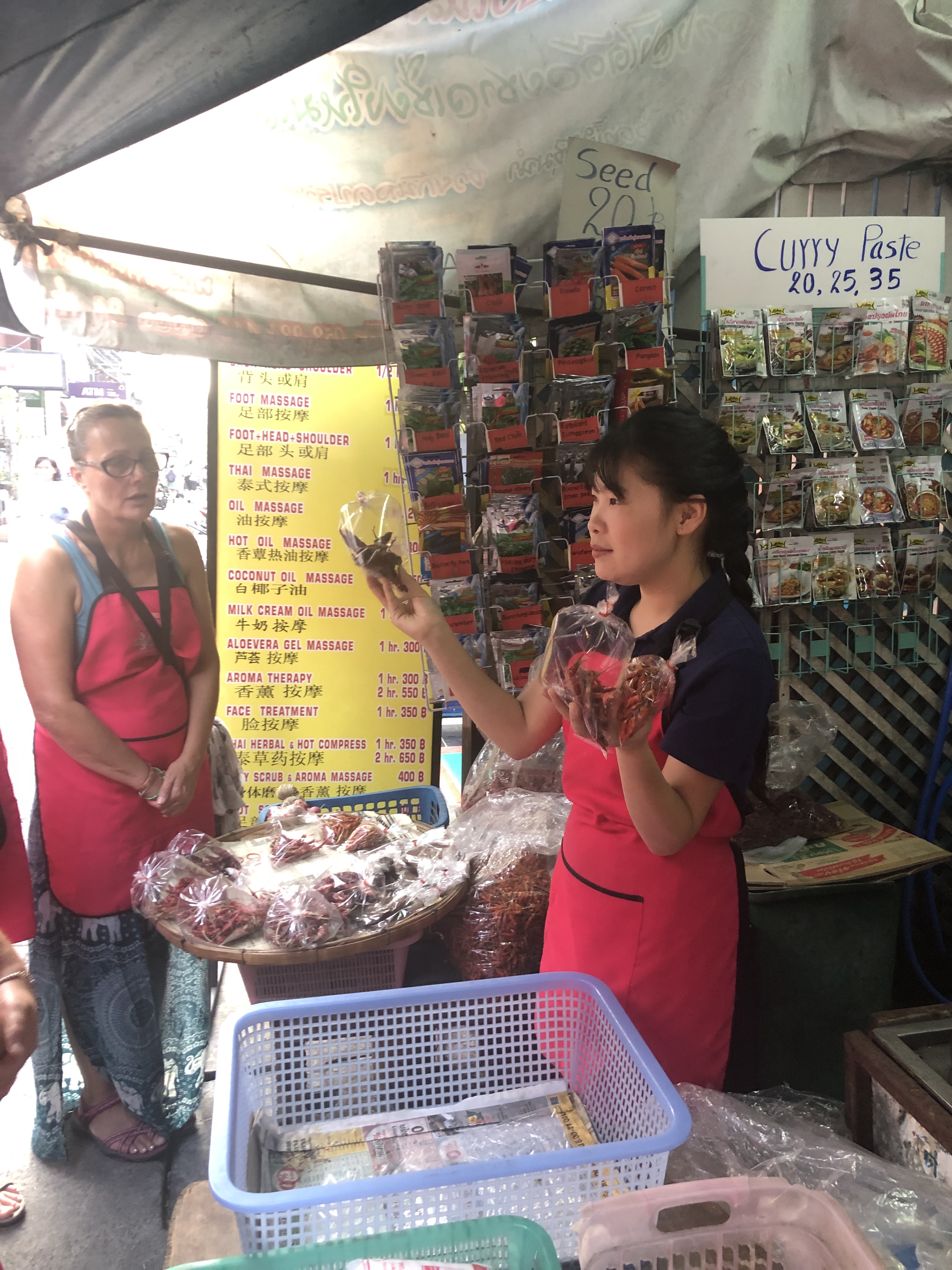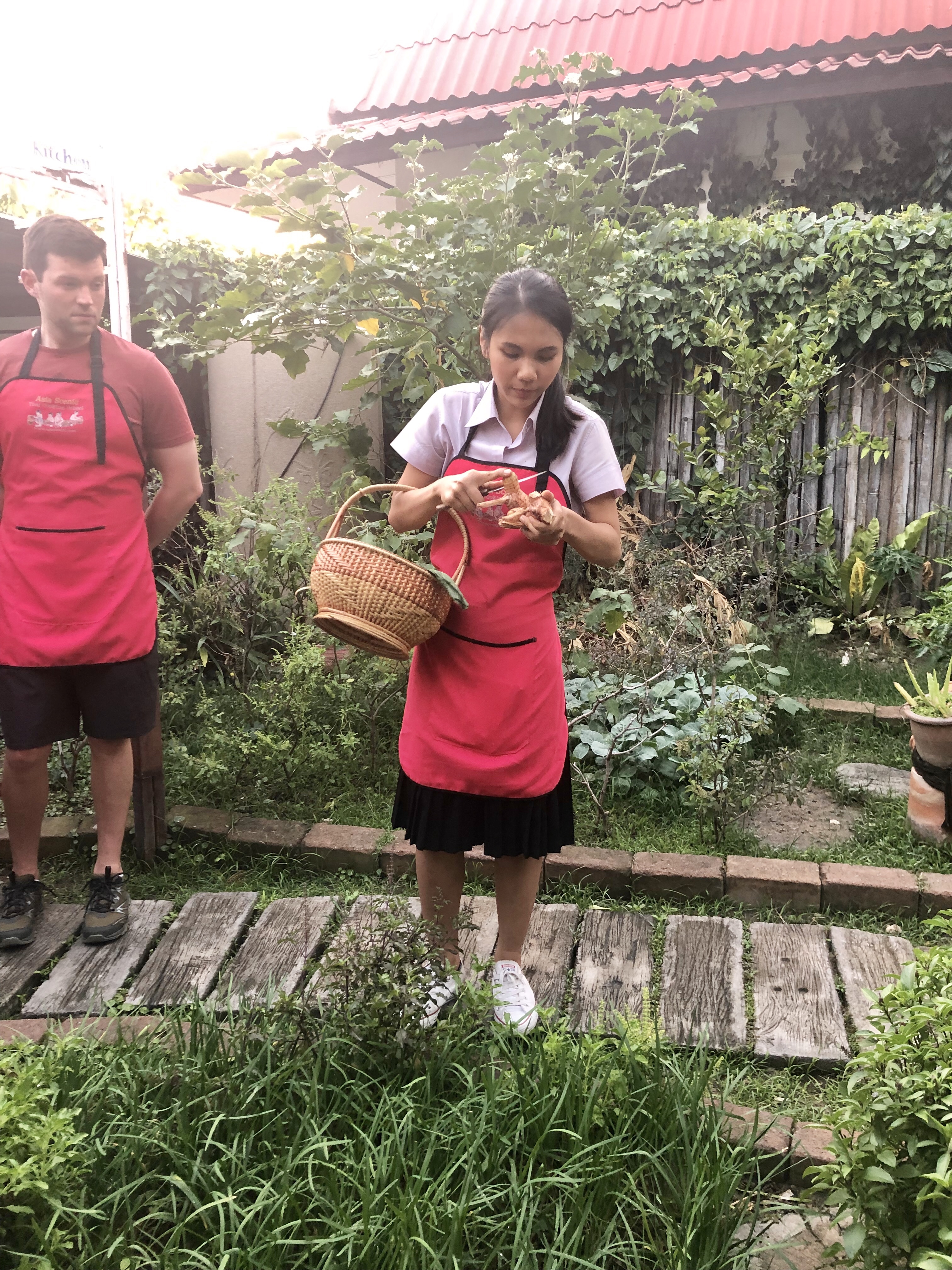 Our food class commenced with an introduction to the dishes by our head chef. She then took us to the local market to buy the ingredients for each dish and to explain the use of each ingredient in traditional thai cuisine. It was fascinating to learn how important fish oil and chilis are to the dishes and how coconut milk was different from coconut cream. We also took a trip to the cooking school’s garden to learn about Thai herbs and plants (such as the 3 types of basil and the uses of the kaffir lime and its leaves to bring out certain flavors). With ingredients and aprons acquired, we headed back to the kitchen to learn how to cook like a real Thai.