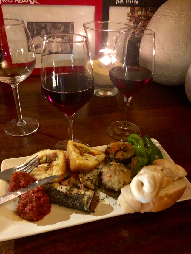 The second highlight was probably grabbing late night snacks and wine at a hip local spot called Hosteria Vite Rossa. When we arrived, there groups for young Italians chatting in the streets while holding glasses of wine. We had so many scrumptious tapas style morsels (Stuffed mushrooms, crab cakes, pork stuffed Italian peppers, etc) and a glass each of full bodied red wine all for 4 euros! I couldn’t have asked for a better way to close out our trip to Venice.